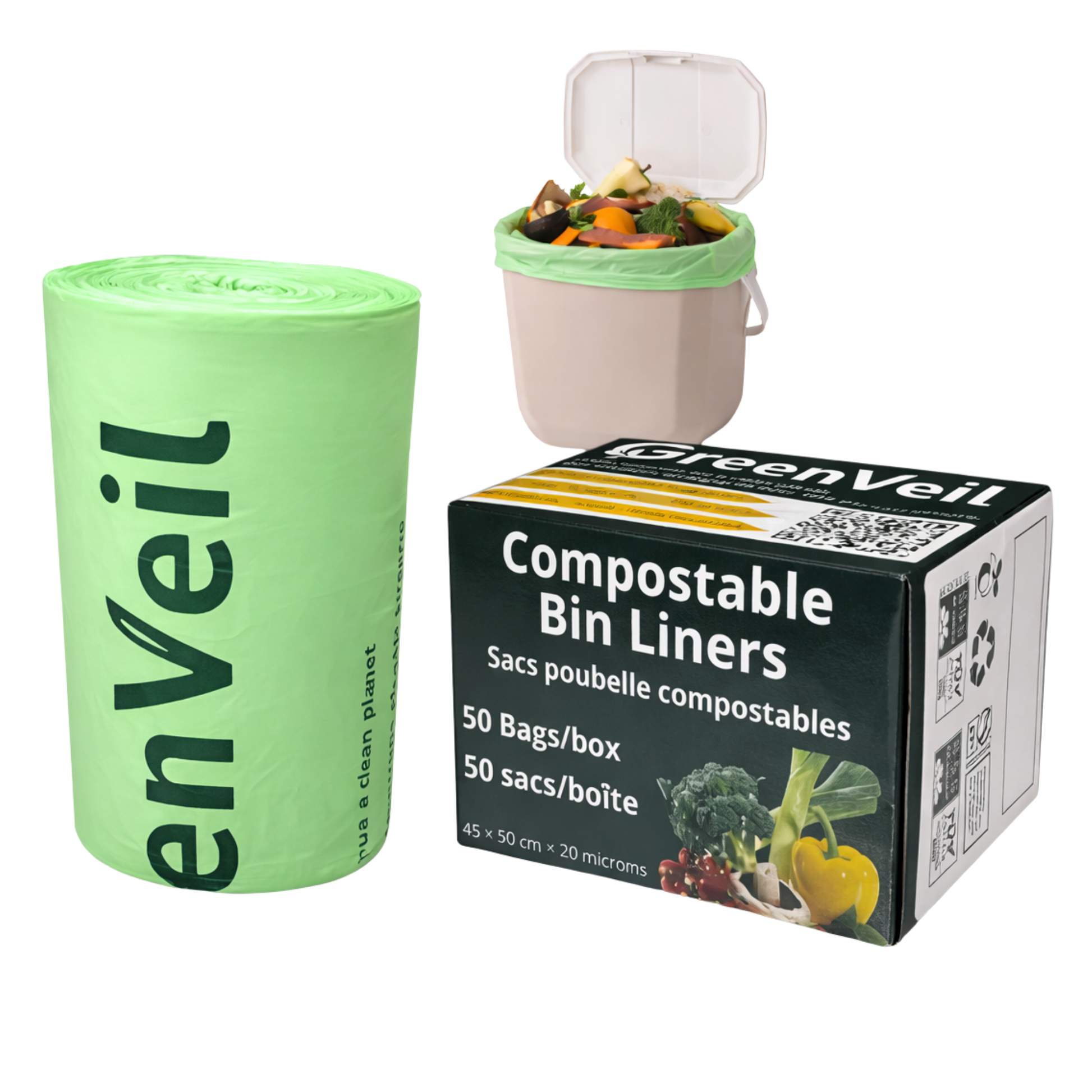 GreenVeil Compostable Garbage Bags are designed for small kitchen and countertop compost bins, making food waste collection simple, clean, and environmentally responsible. Manufactured from plant-based PLA, PBAT, and cornstarch, these bags are certified compostable and designed to break down into natural components under proper composting conditions.