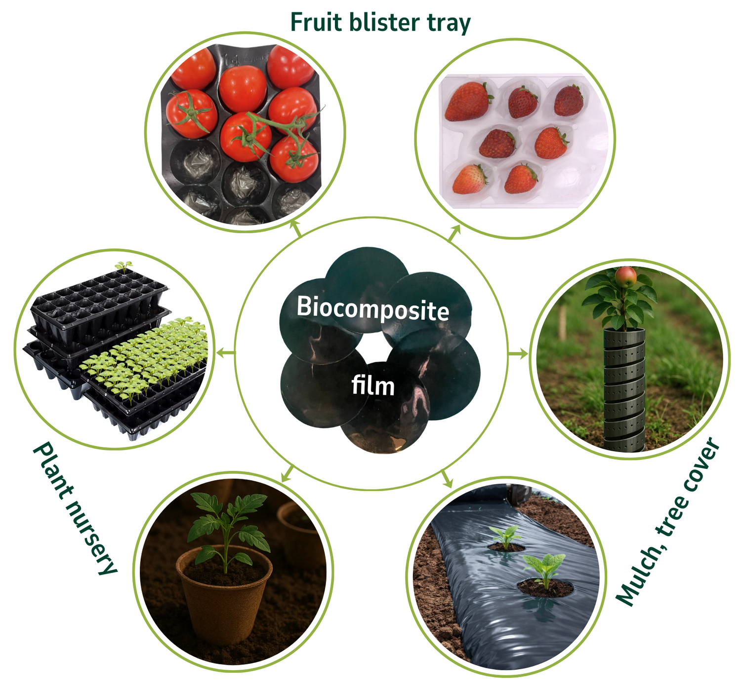 GreenVeil’s core innovation is a biodegradable biocomposite film platform that can be configured into multiple product formats across food and agriculture, including fruit blister trays, nursery plug trays, tree protection covers, and mulch films.