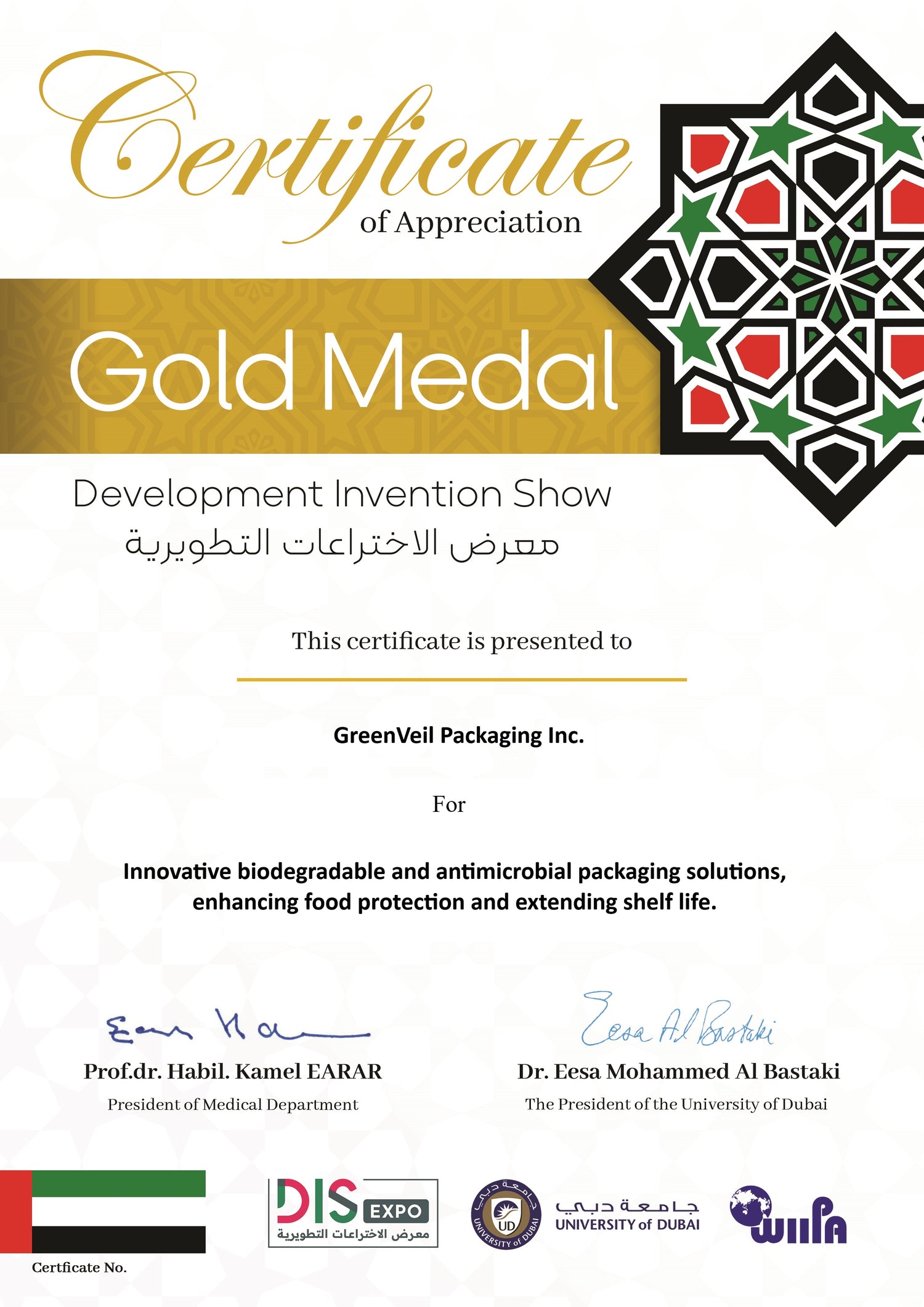 GreenVeil Packaging proudly received a Gold Medal at the DIS International Invention Show 2024, held in Dubai and hosted by the University of Dubai.